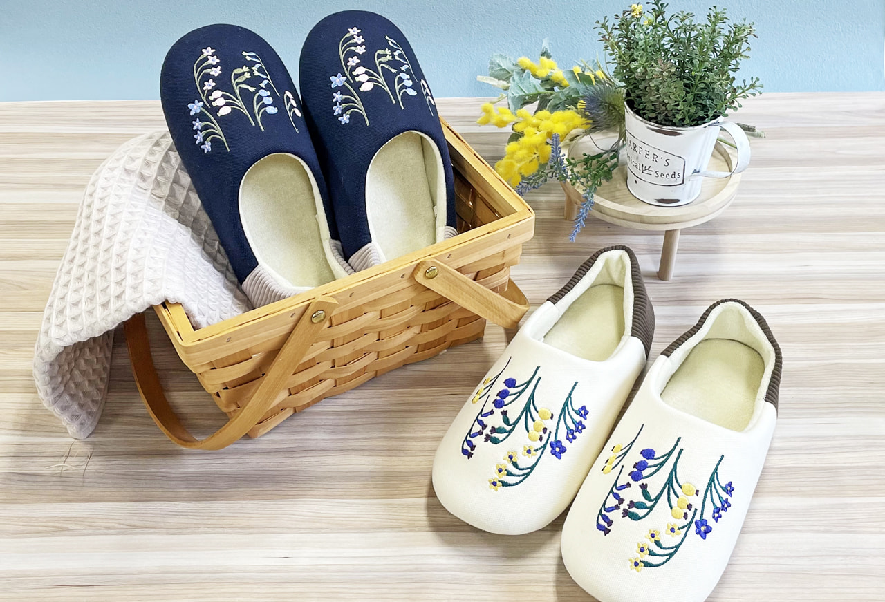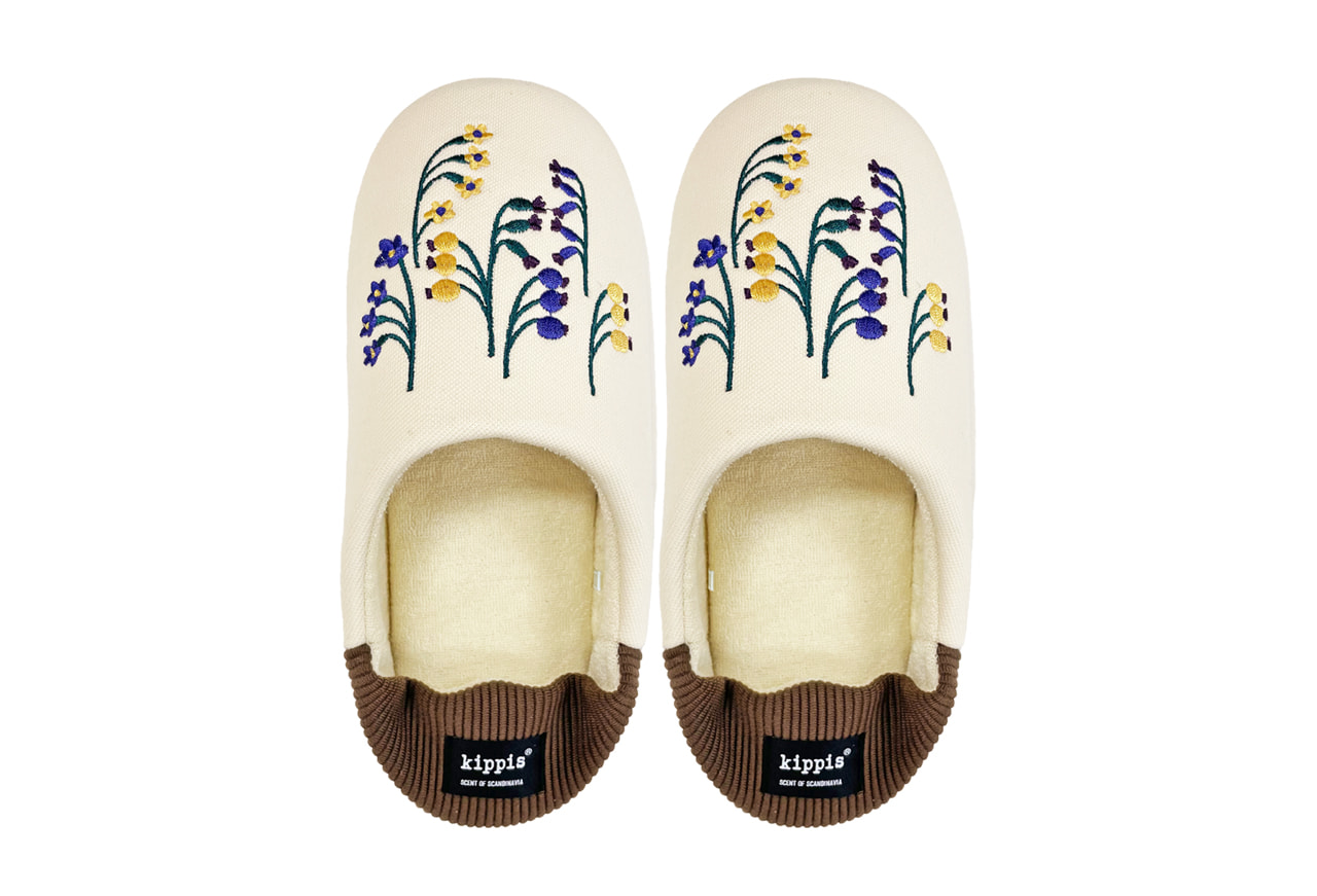 夏のフィンランドの美しい風景の1つ、野花が咲く花畑を描いた柄を刺繍で表現しました。年間通して履ける素材で、踵を踏んでバブーシュ風に、踵を上げてルームシューズとしても履ける2wayタイプです。